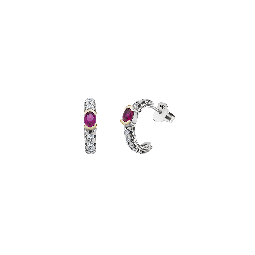 Joia de enorme elegância, inspirada na arquitetura dos riads e nos seus luxuosos jardins. Com uma pedra central cor rubi, estas argolas em prata e ouro foram desenhadas para poderem ser usadas em conjunto com outras joias da coleção e são de estrutura leve e confortável. Uma joia para mulheres fortes e confiantes.
