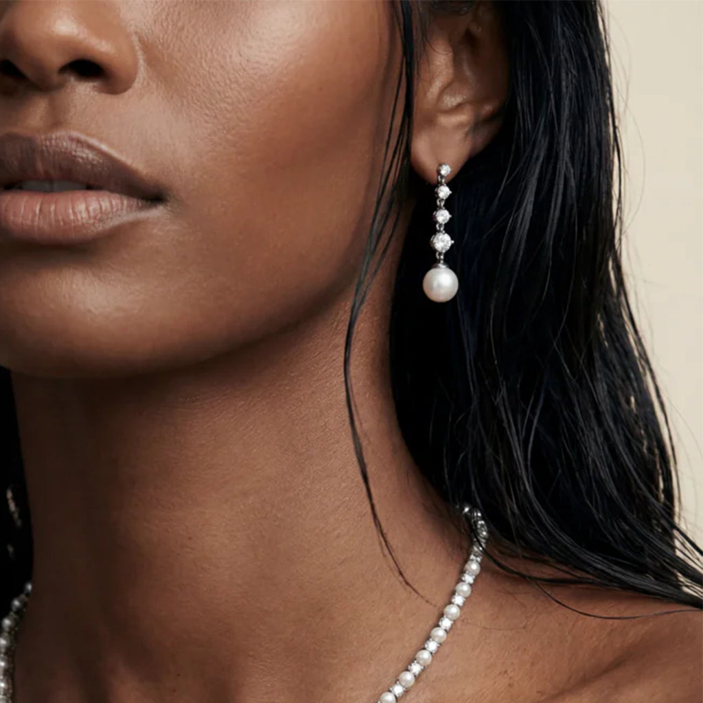Brincos longos Éclat em prata banhada a ródio com uma pérola branca de 8 mm e zircônias cúbicas. O design alongado de 3,5 cm combina movimento e sofisticação, onde a pérola é acompanhada por zircônias cúbicas que captam a luz a cada movimento, adicionando um brilho sutil e elegante.