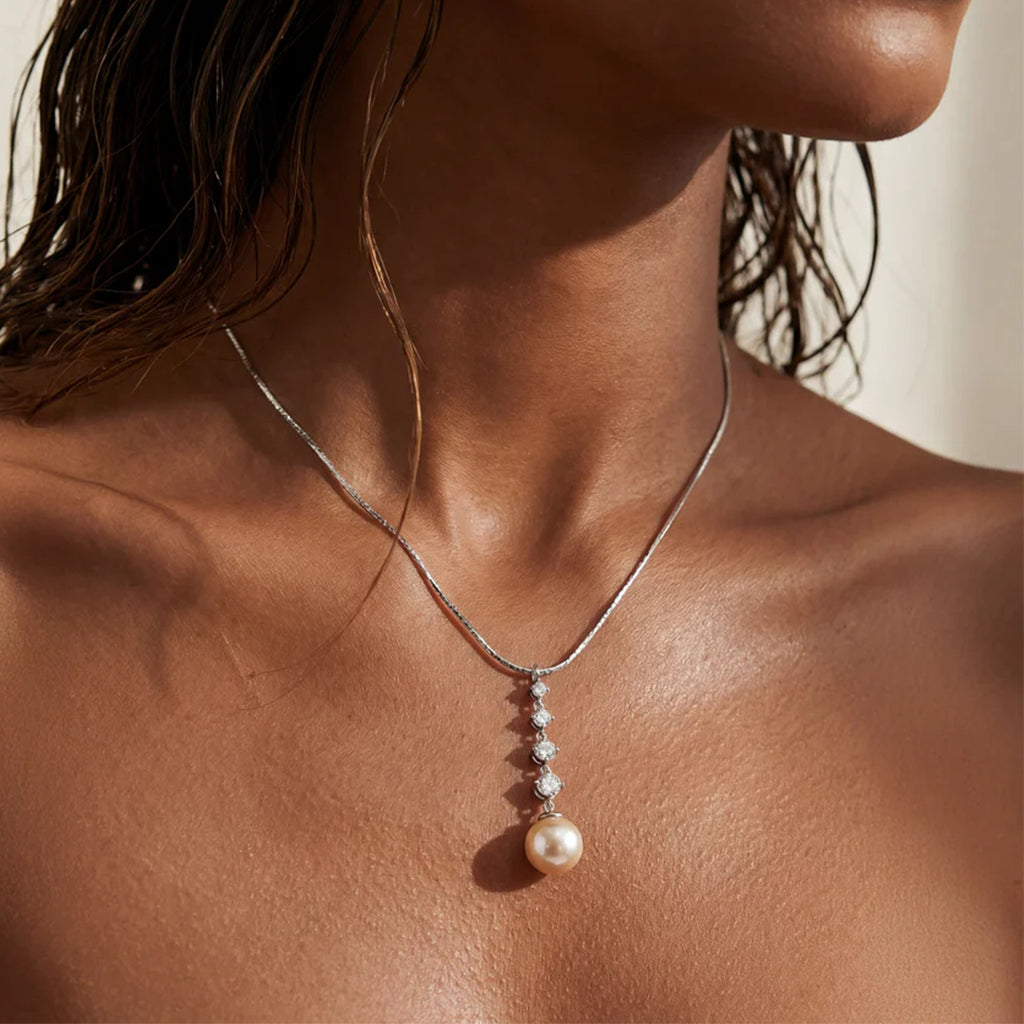 Colar Aurora em prata com banho de ródio, pérola de 10 mm e zircônia cúbica. Design com corrente ajustável que combina elegância minimalista e brilho sutil, capturando a luz a cada movimento.