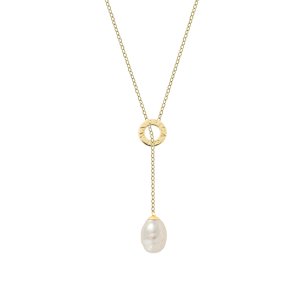 Pendente com corrente de 42 cm, em prata banhada a ouro 18k, e uma pérola barroca branca em formato de pera de 12 mm. Para um visual inconfundível. A coleção Luar eleva seu estilo com pérolas barrocas que capturam o misticismo da lua. Joias clássicas reinventadas com um toque moderno. Chique, moderna e cheia de personalidade.