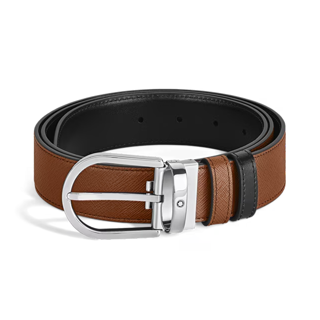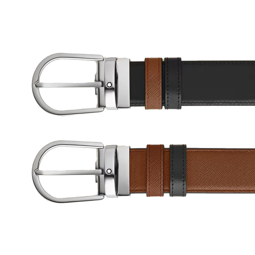 Este cinto reversível combina elegância e versatilidade, oferecendo dois estilos distintos em um único acessório. Apresentando a nossa icônica fivela em forma de ferradura Montblanc com acabamento em paládio, um lado da tira de 35 mm é revestido em couro Saffiano na cor fauve, enquanto o verso exibe o elegante couro Meisterstück preto, para um toque de sofisticação clássica.