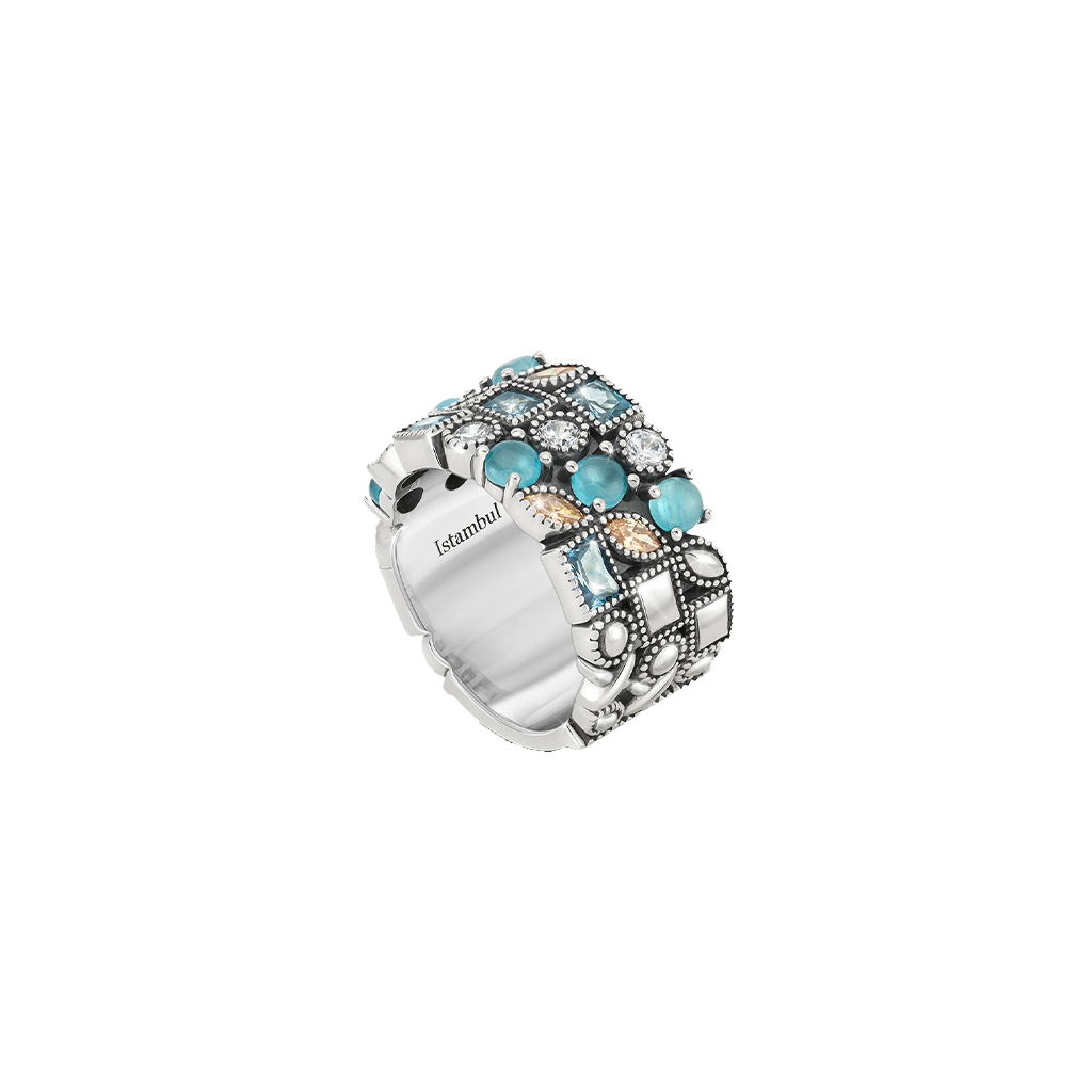 Anel em Prata de Lei 925 da coleção Istambul, com um design marcante e diferenciador. Inspirado nos contrastes desta cidade, este anel traduz-se numa joia com forte presença e com uma riqueza de cor, padrões e detalhes. As pedras de cor remetem para o Bósforo e para os reflexos da luz da cidade na água.No interior, encontra a palavra “Istambul” gravada, que reforça a ligação à cidade que inspira esta coleção.Produzido manualmente, foi pensado para quem procura uma joia com presença.