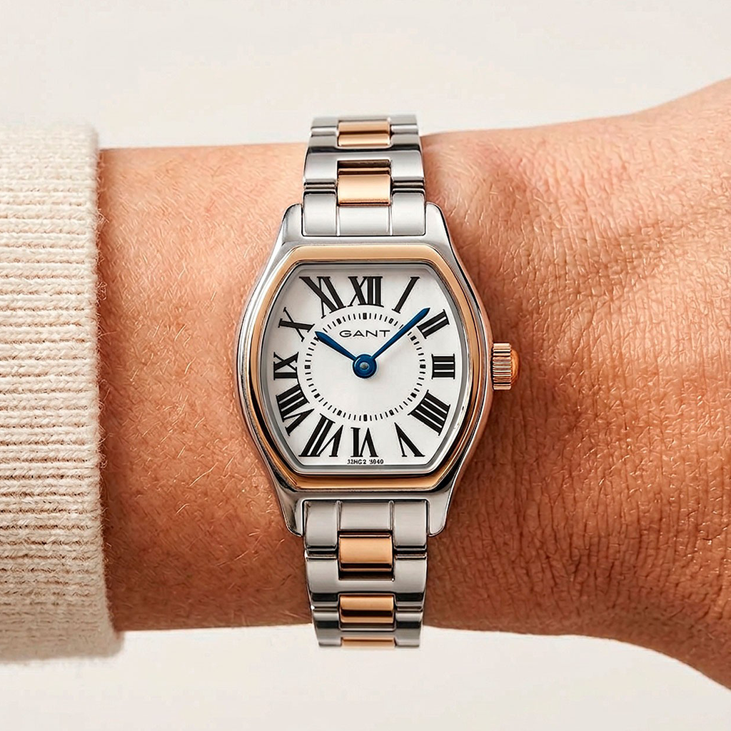 Relógio GANT de design elegante com mostrador de formato tonneau e linhas modernas. Combina um estilo contemporâneo com detalhes discretos e acabamento cuidado, sendo uma peça versátil e ideal para o uso diário com sofisticação.